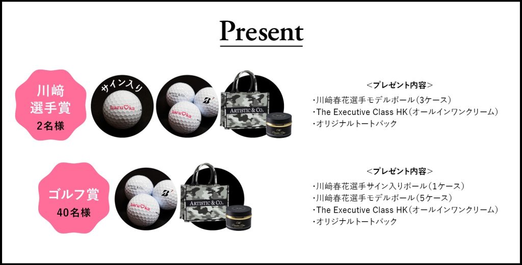 川﨑選手のサイン入りボールと美容クリーム、トートバックの特別セットを抽選で2名様にプレゼント!さらにゴルフ賞も40名様にプレゼント!