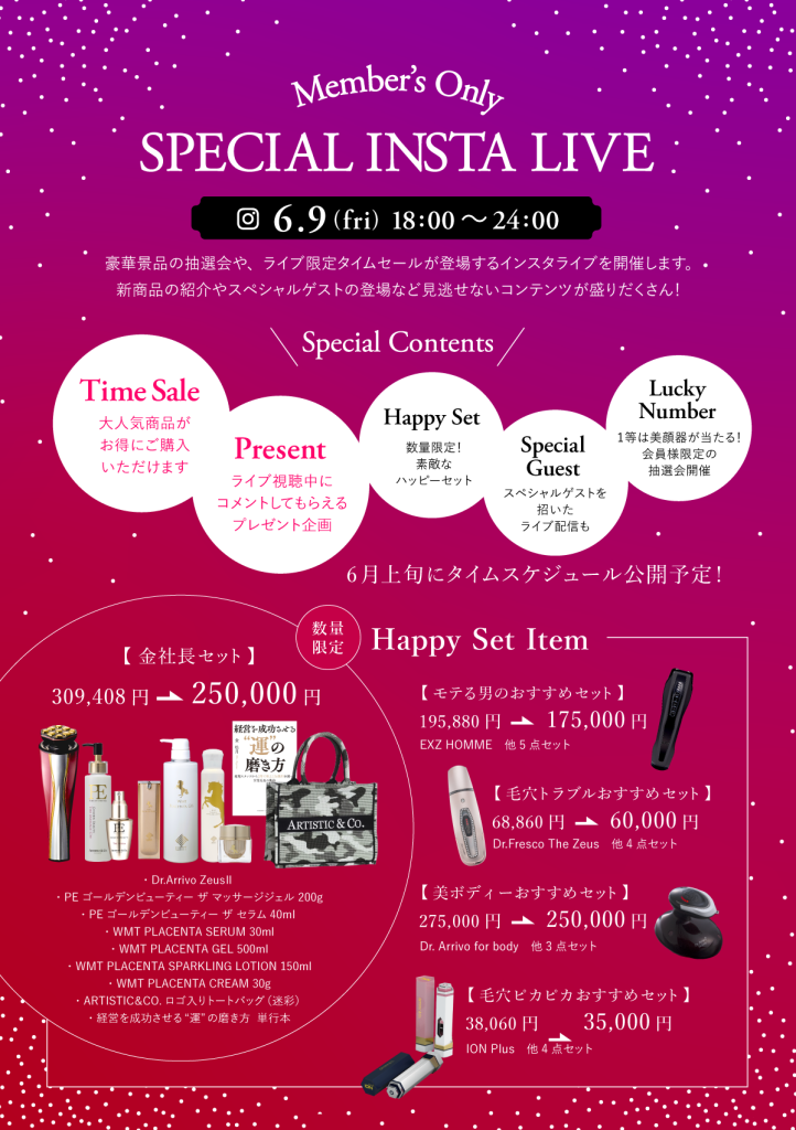 2023年6月9日(金)18:00~24:00の6時間限定、「Member’s Only SPECIAL INSTA LIVE」をインスタライブ(@artistic.co.official)にて実施します。